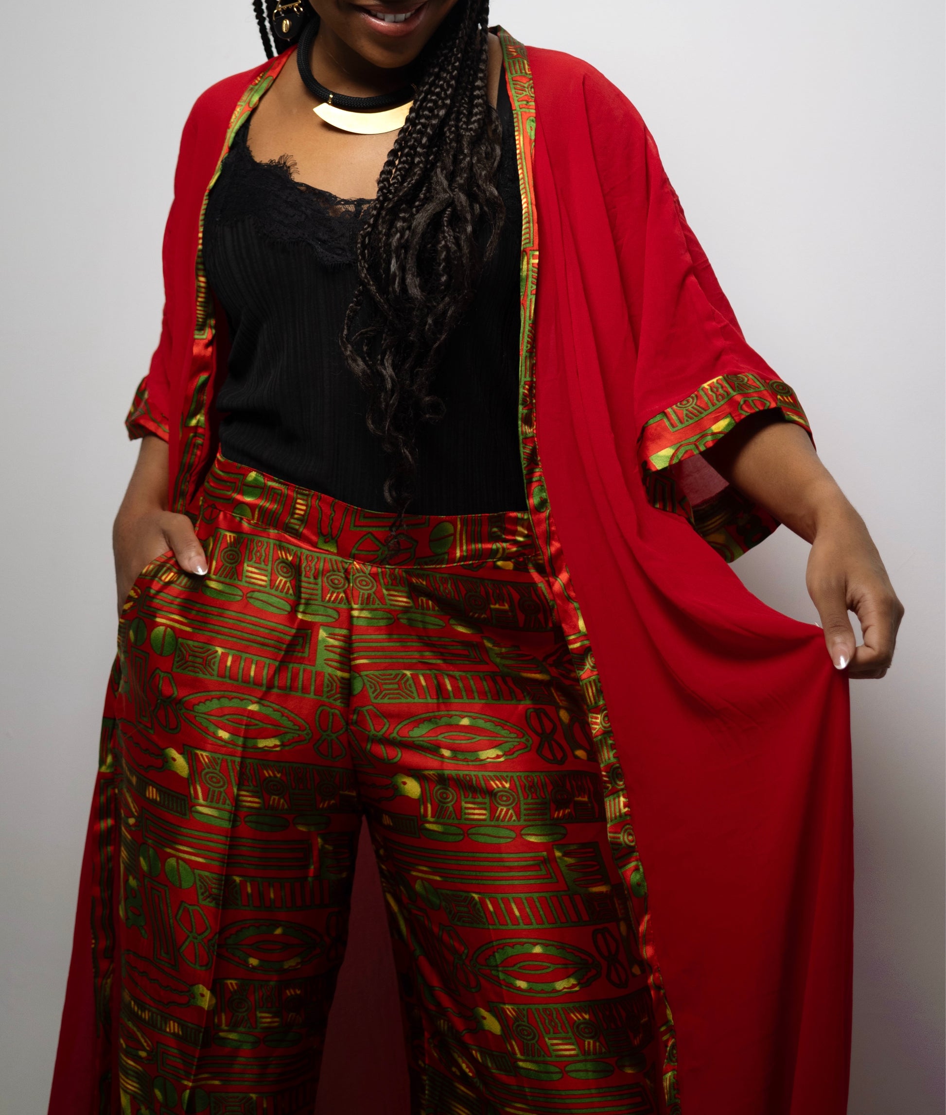 Le Set Mwanga incarne l’élégance et la force des racines africaines à travers un tissu fluide et raffiné. Le pantalon au motif rouge et doré se marie harmonieusement avec un long kimono rouge. À porter avec un top sobre pour laisser le tissu s’exprimer, ce look allie tradition et modernité. Idéal pour illuminer vos journées ou vos soirées, il célèbre la fierté et la lumière intérieure.