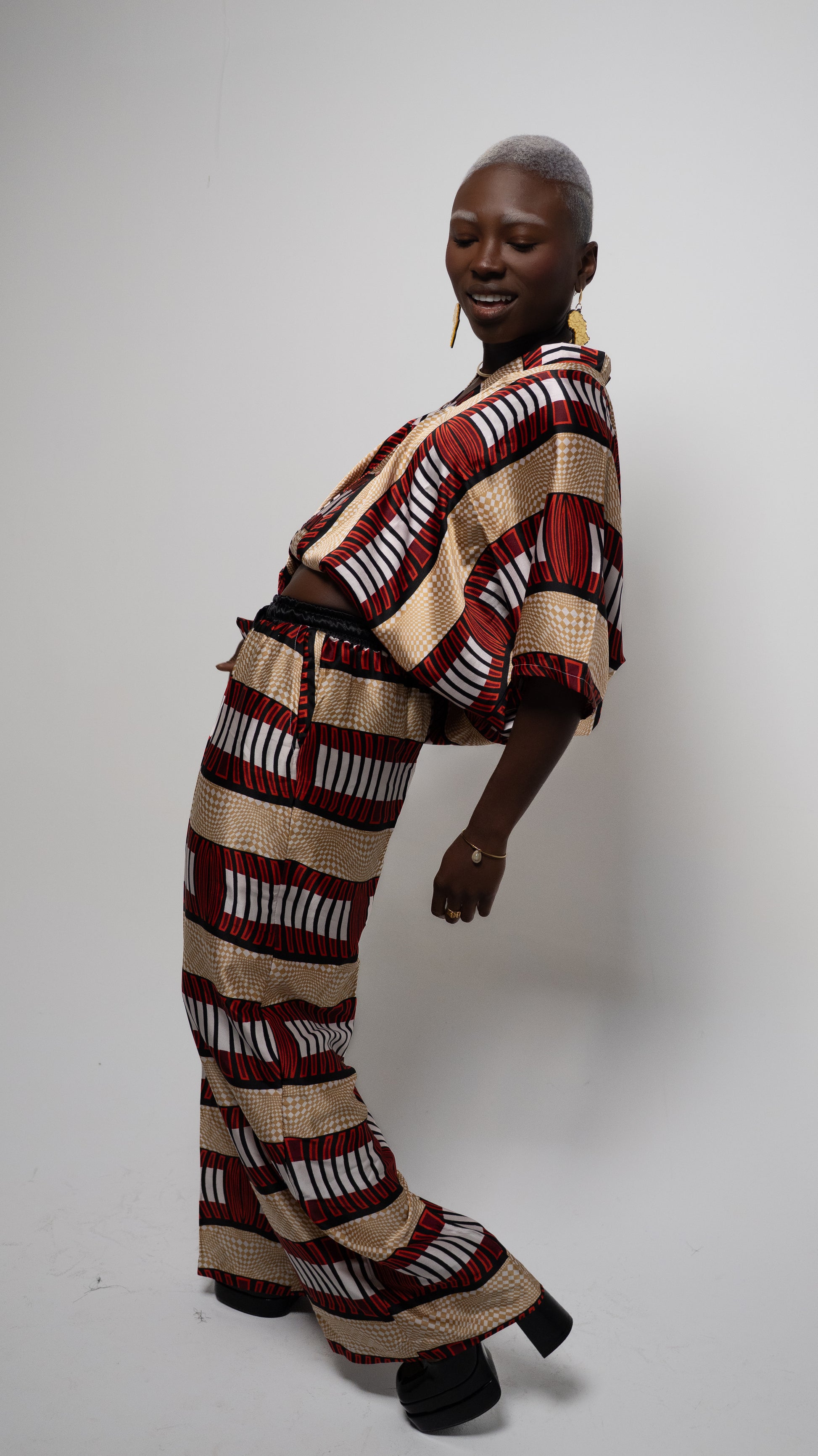 L’ensemble Uhuru incarne l’élégance et le confort. Conçu dans un tissu de qualité, il associe une chemise ample à manches courtes et un pantalon fluide pour une silhouette moderne et décontractée. Ses motifs rouges, dorés et blancs symbolisent la force, la richesse et l’harmonie. Parfait pour vos sorties ou moments de détente, cet ensemble apporte une touche culturelle raffinée à votre style.