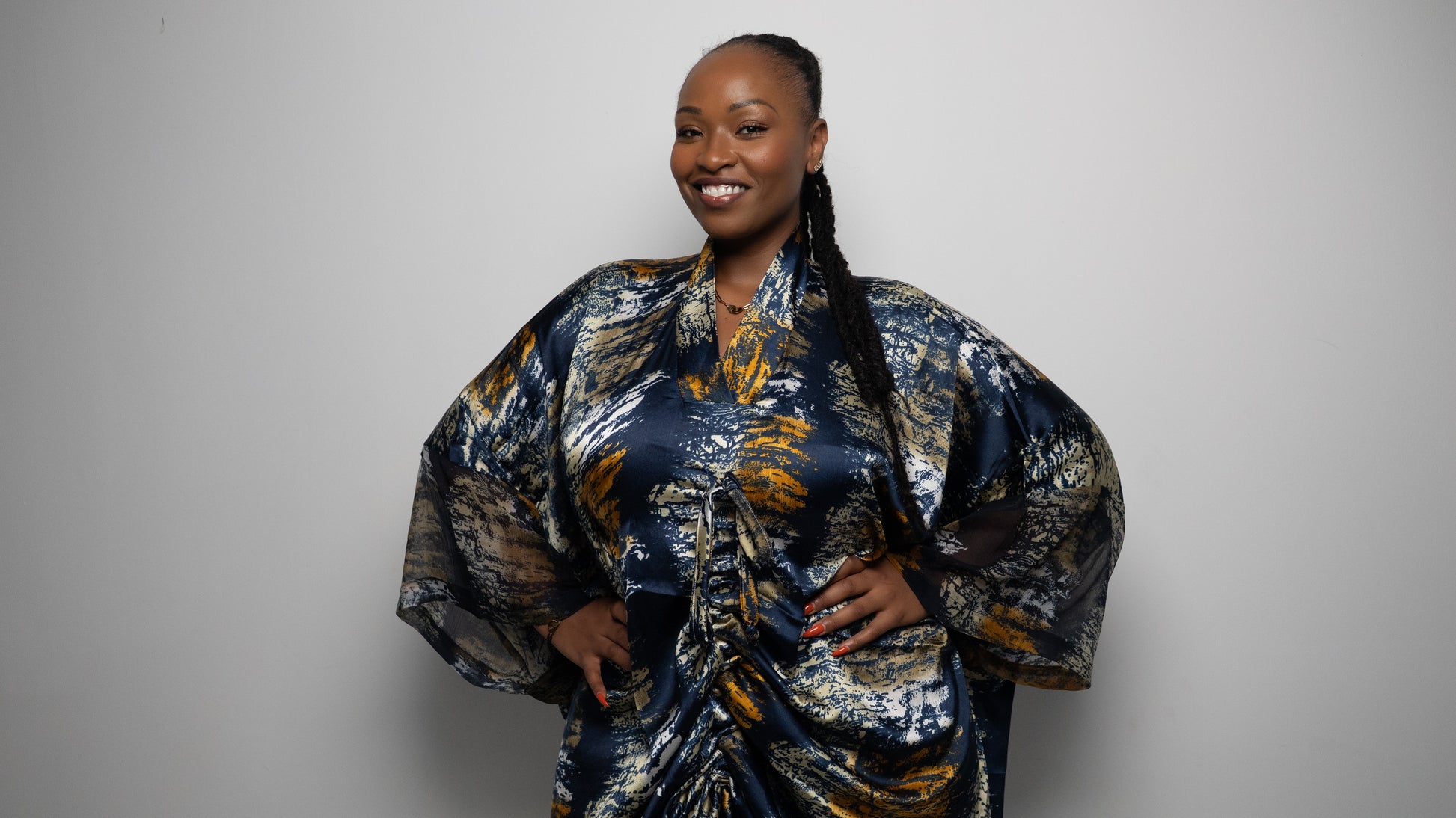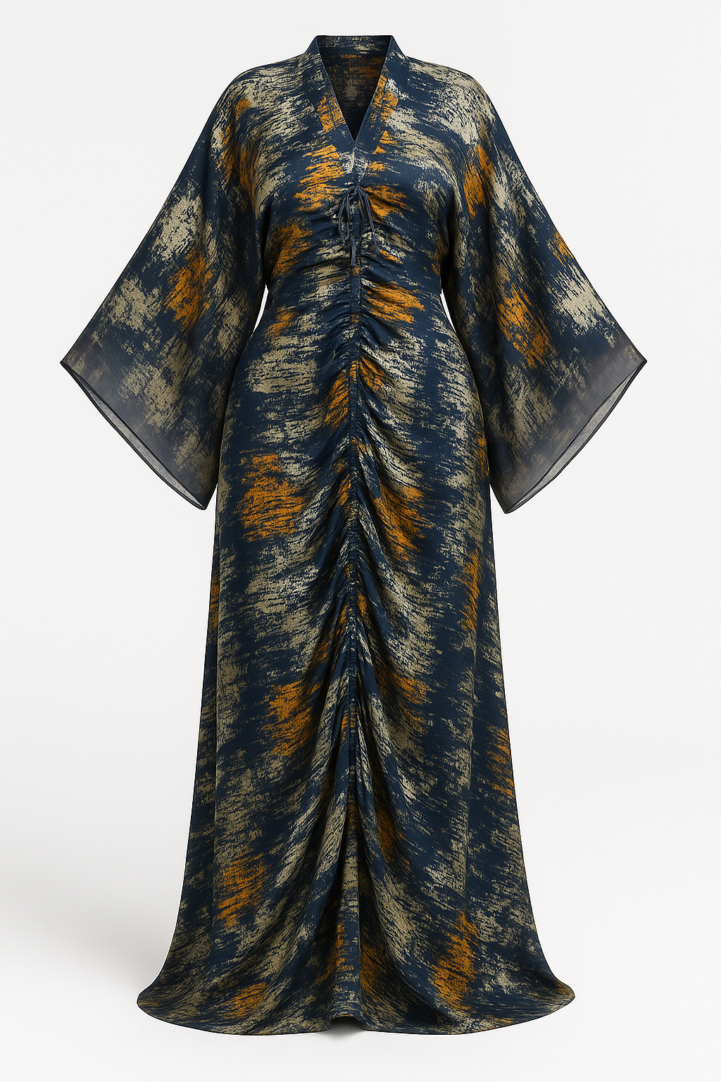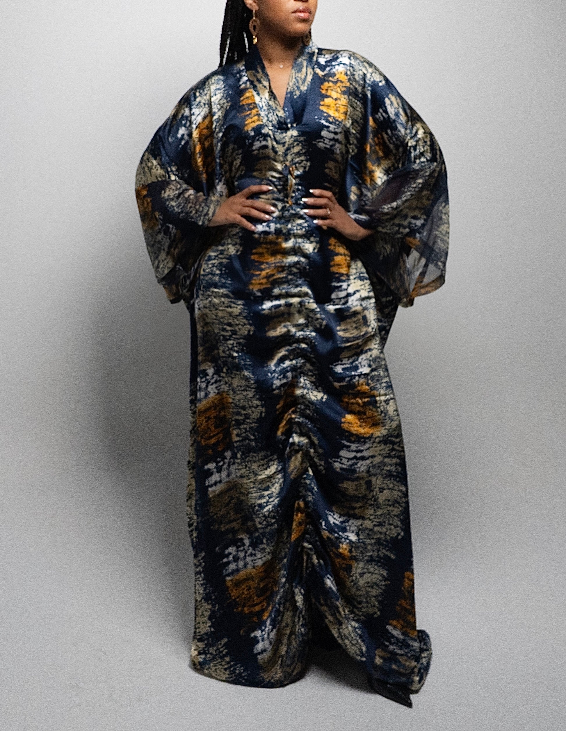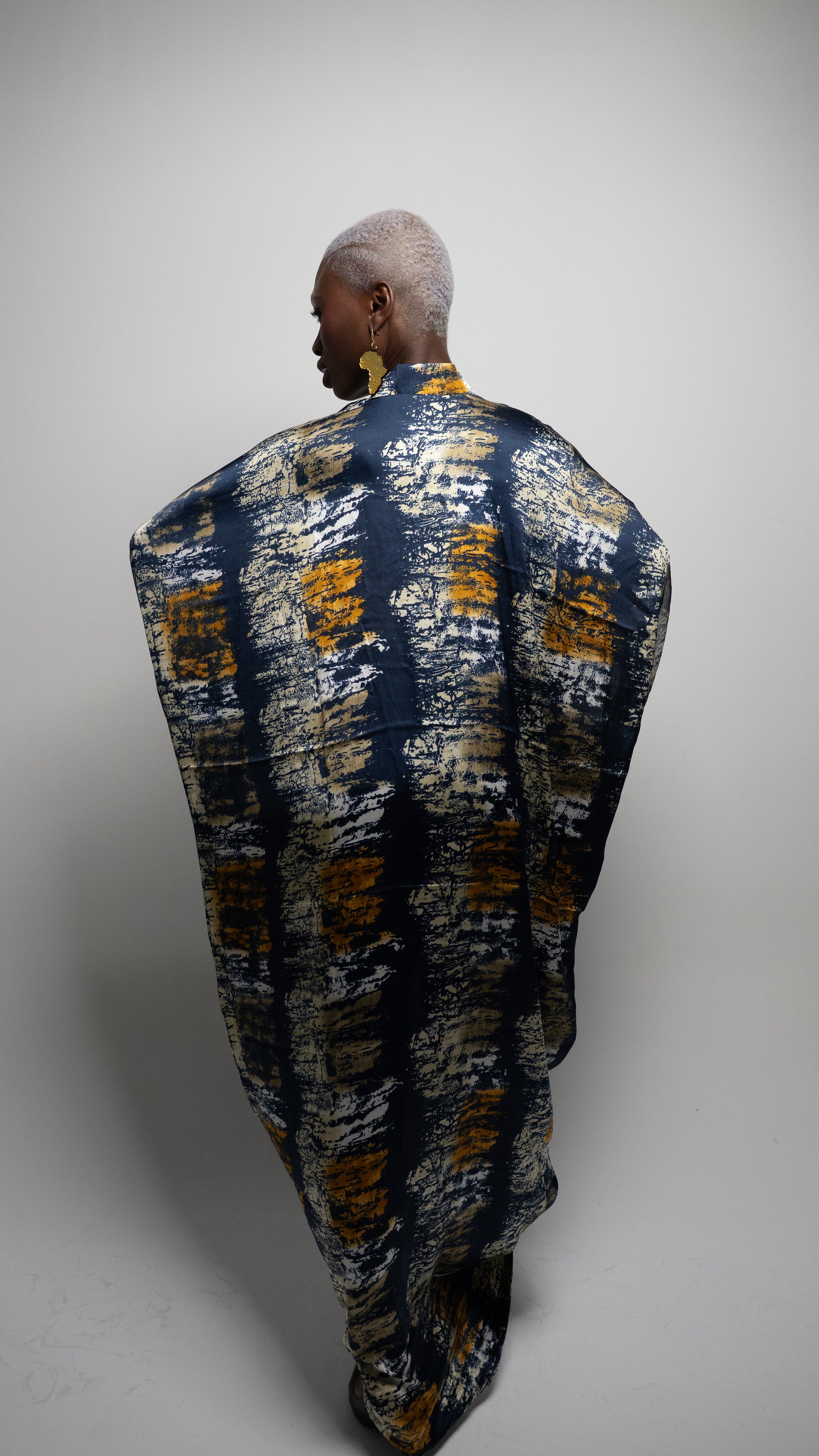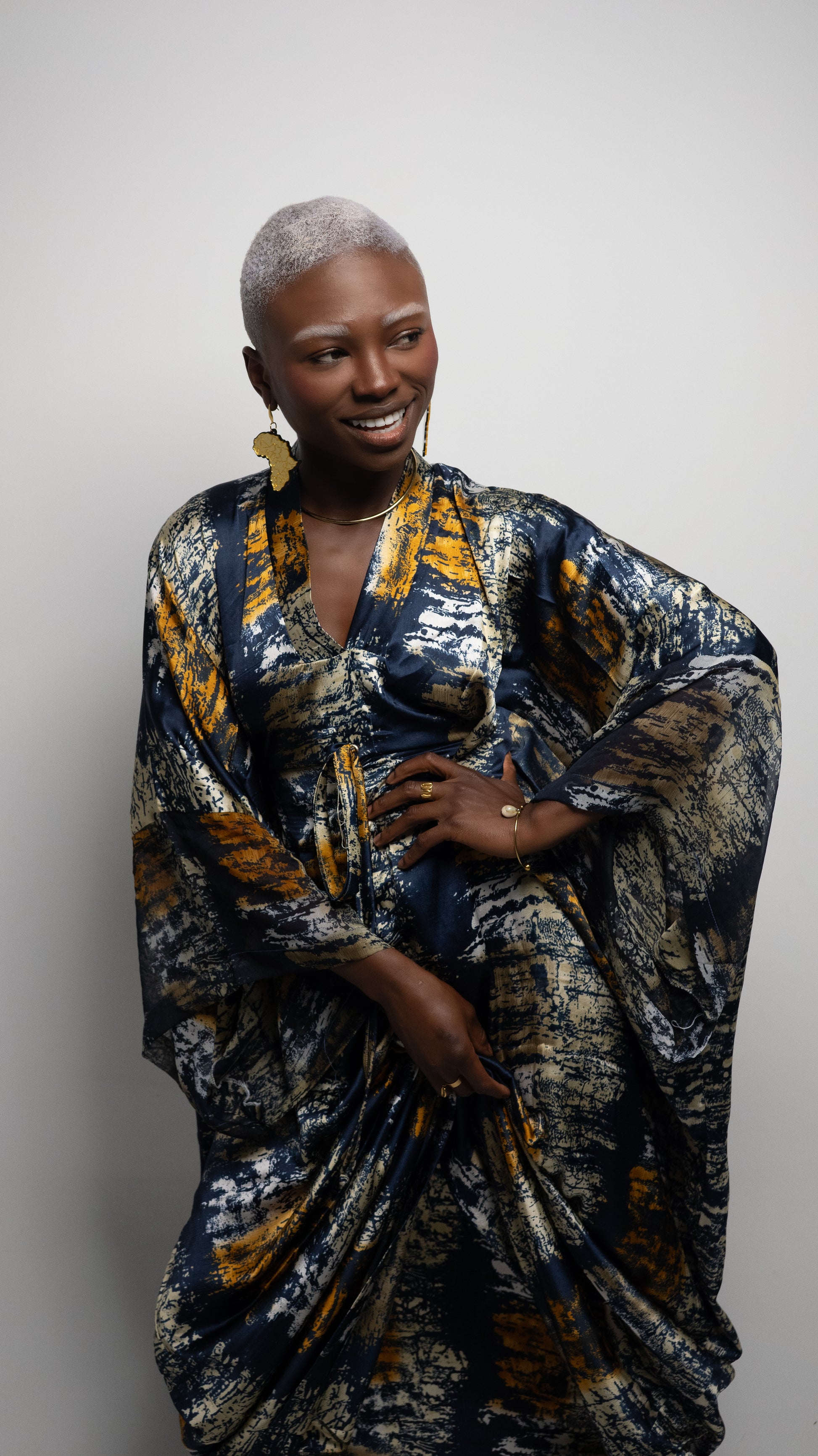 La robe Usiku allie élégance et confort avec son tissu satiné aux reflets bleu nuit, dorés et beiges. Sa coupe fluide met en valeur toutes les morphologies, tandis que ses manches amples et légèrement transparentes apportent légèreté et raffinement.